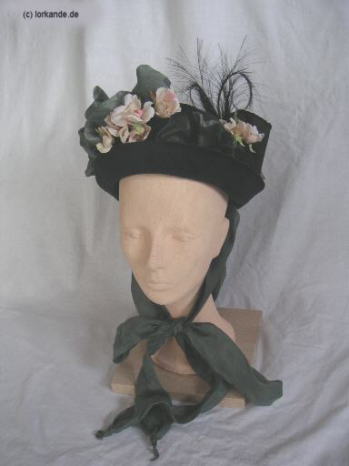 Samthut mit Reiherfedern, Seidenchiffonband und Blumen
