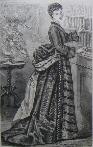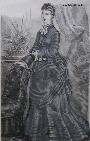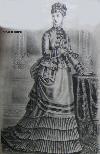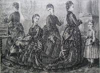 | v.l.n.r Reisekleid (hellgrüne Seide, dunkelgrüner Samt, -Samthut) Promenadenkleid (altrosa Kaschmir/Grosgrain, Filzhut), Empfangskleid (beige Seide und beige-hellblauer Seidenchangeant, Samthut), Hauskleid (schwarzer Samt, smaragdgrüner Popeline), Abendkleid (rosa Seide) | Schwarze Seide, Jetverzierung, Plastron aus pinker Seide mit weißem Tüll und weißer Jetstickerei | Rock schwarzer Samt, Tunika und Taille graue Vikunja-Wolle |