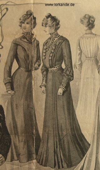 | Noch stärkere Ausstellung des Rocksaumes, Betonung der Unterärmel, "weichere" Stilelemente | Betonung des Oberärmels, viele "weiche" Stilelemente, weiche Rocksilhouette | |||||