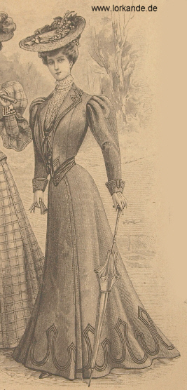| Betonung der "Hühnerbrust", schmale Ärmel, Rock wird am Saum weiter, vordere Rocklänge bodenlang. Etwas "herber" Stil, wenige spielerisches, viele geometrische Linien, Posamenten | Betonung der "S-Linien-Form", verstärkt Betonung der Unterärmel, weiterer Rocksaum | |||||