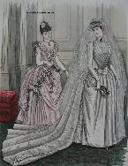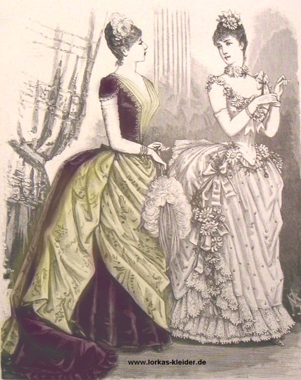 | links Rock u. Taille Seide, Draperie Tüll rechts Taille und Schleppe aus Faille, Schleppe mit Plüsch unterfüttert, Latz und Rock Damast |