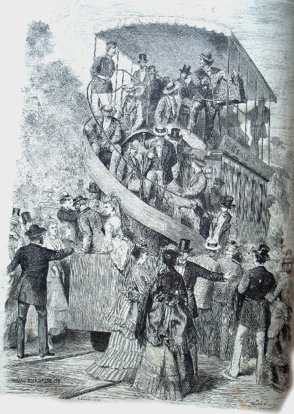 Zwanzig Familieväter und galante Bräutigams springen zugleich auf einen lebensmüden Wagen, vor dem ein athemloser Gaul stolpert, und dem Frechsten gehört das Fuhrwerk, das heißt, wenn der Kutscher noch im Stande ist, seinen Gaul vielleicht heute zum zwanzigsten Mal heute zur Stadt zu peitschen.