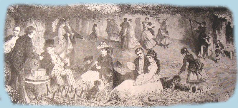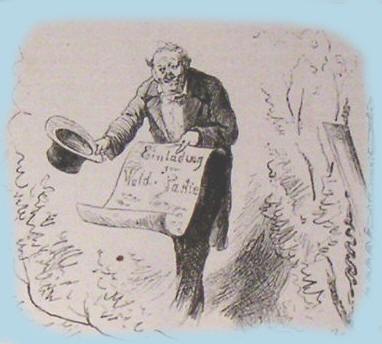 Aber auch reelere Genüsse winken bereits! Wie es der Regierungs-Assessor Schmachthuber und seine beiden Collegen vom Appelationsgericht ermöglich haben, fast eine halbe Stunde vor dem Eintreffen der Niesemeischelschen Familie an Ort und Stelle zu sein, - wir wissen es nicht. Jedenfalls sendet, als die letztgenannten Herrschaften nebst Kanzleiraths dem Stellwagen entquellen, bereits unterm Laubdach eines prächtigen Eichensstammes - diesmal ohne Raupen - eine Bowle ihren Maienduft zu den Zweigen empor.