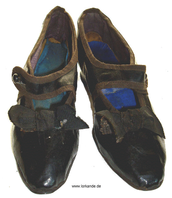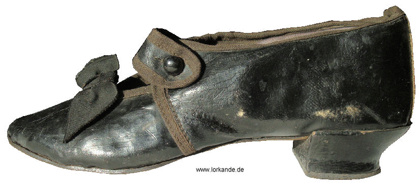 passende Schuhe für Kinder zu bekommen. Bei dem Begriff "Lackschuh" ging ich von Lackleder aus, wie es auch bei Damenschuhen vorgekommen ist. Offenbar handelt es sich bei diesem Paar Schuhe jedoch um die Sonntagsschuhe der Tochter kleiner Leute, denn sie sind vollständig aus Baumwollsatin gefertigt, der Lackeffekt entsteht durch einen Überzug aus einem Lack, ich vermute Schellack, der den Satin versteift. Durch schadhafte Stellen kann man sehr deutlich erkennen, daß der Stoff direkt schwarz lackiert wurde.