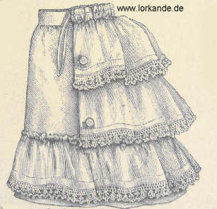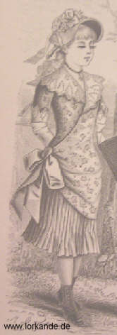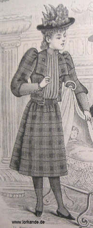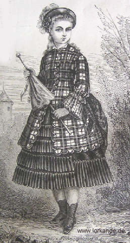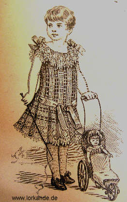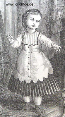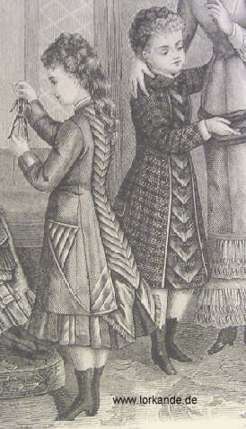 Die Altersangaben in Modezeitungen für Kleidung von Mädchen ab 4 Jahren beziehen sich auf die Schnittführung, nicht auf die Gestaltung des Kleides. In den Taillengrundschnitt wurden mit zunehmendem Alter Abnäher eingearbeitet, erst ein einzelner flacher, später ein oder zwei tiefe, um die Figur zu modellieren. Auch die Anzahl der Schnitteile veränderte sich. Während das Jahreskleid noch mit nur einem Rücken- und Vorderteil auskam, passte sich das Kinderkleid für 9jährige bereits mit separatem Seitenteil zusätzlich an. Auch komplexere Kleiderformen nahmen mit wachendem Alter und Eitelkeit zu. Bis ca. 1875 wurde auch von Mädchen unter 9 Jahren oft ein Kleiderrock getragen, die Modebilder lassen nur diesen Schluß zu. Es ist aber anzunehmen, dass der Rock ebenso wie der Unterrock und das Beinkleid am Leibchen festgeknöpft wurde oder in irgendeiner Form mit der Taille darüber verbunden. Nach 1875 waren bis zum Alter von ungefähr 9 Jahren an die Taille angesetzte Rockteile üblich, der separate Kleiderrock wurde standardmäßig normalerweise erst von „Backfischen“ getragen. |
