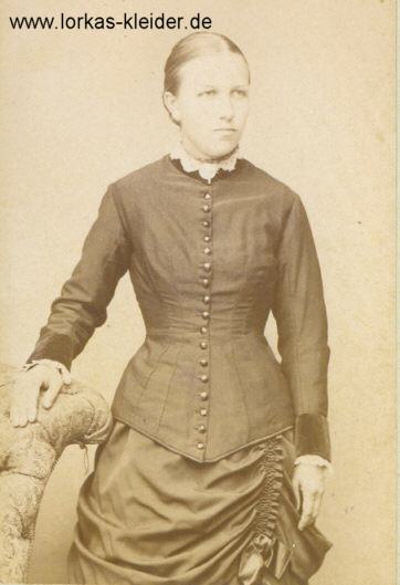 Die meisten Fotos der damaligen Zeit zeigen recht stabile Figuren, spätestens nach dem ersten Kind. Von Wespentaille ist da keine Spur. Natürlich gibt es auch Bilder von sehr schlanken Frauen, die auch den Eindruck machen, als wäre stark geschnürt worden. Zum einen sind diese meistens aber noch sehr jung und zum anderen ganz eindeutig nicht der Durchschnitt. Hinzukommt, daß die Frauen damals deutlich kleiner waren, die Proportionen also auch schon ganz anders wirken.Eine Ausnahme sind sicherlich offizielle, gesellschaftliche Anlässe, allen voran Bälle, bei denen es einen Mann zu fangen gilt. Dort war natürlich jedes junge Mädchen bemüht, einen möglichst positiven Eindruck zu machen. Allerdings nützt auch dort das Schnüren bis zum Anschlag nichts, weil einem dann schlichtweg die Puste zum Tanzen fehlt. Ein gut sitzendes Korsett ist ein durchaus bequemes Kleidungsstück und beileibe kein Folterinstrument. Wer es regelmäßig trägt wird mit der Zeit mehr schnüren können als jemand, der es nur 2x im Jahr zu Kostümtreffen anzieht. Auch hilft es, das Korsett bereits morgens anzuziehen und tagsüber regelmäßig nachzuschnüren. Aber auch dann ist irgendwann die Grenze des persönlichen Wohlfühlschnürens erreicht und man sollte es nicht zum Wettkampf ausarten lassen, wer denn nun die schmalste Taille hat. Klar, es gab die Elisabeths von Österreich, die trotz einer Körpergröße von 1,72 einen sagenhaften Taillenumfang hatten, aber unter heutigen Gesichtspunkten war das Körperempfinden z. B. dieser Dame mehr als pathologisch, also ein denkbar schlechtes Vorbild. Und klar, es gibt auch heute Frauen, denen das Blut der offenen Blasen schon aus dem Schuh tropft, die aber trotzdem mit Stilettoabsatz und mörderischer Schuhspitze durch die Gegend stöckeln. Aber der Orientierungspunkt sollte ja nicht das Extrem sein, sondern das eigene Wohlbefinden, denn man wertet sich mit 2 cm mehr oder weniger Taille nicht auf. Den Ehrgeiz beim Korsetttragen würde ich lieber in ein detailfreudiges Kleid stecken, das macht einen wesentlich besseren Eindruck als eine laufende 50cm-Taille, die ständig Schwindelanfälle hat. Also keine Angst vorm Korsett und keinen falschen Ehrgeiz bei seiner Anwendung, das bereichert das Kostümerleben ungemein. J Und zum guten Schluß eine nach meinem Dafürhalten normale und durchschnittliche Figur der 1880er Jahre mit Korsett: