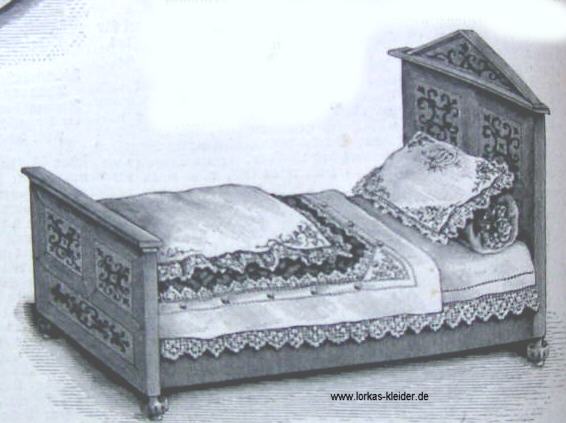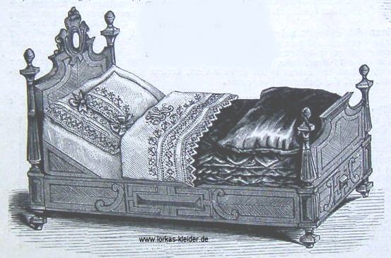 Das moderne Bett1873Das einfache und elegante moderne Bett hat zwei Matratzen, eine aus Roßhaar und eine aus Federn, ein Keilkissen und ein nicht zu großes, mit Daunen gefülltes Kopfkissen. Ein zweites Kopfkissen ist überflüssig. Die Decke soll aus einer mit Federn oder Wolle gesteppten Decke und einem leichten, nicht zu kleinen, gefügigen Plumeau bestehen. Auch ist ein leichtes Federdeckbett mit doppeltem Überzug, der untere aus farbiger Seide, der obere aus Schleierleinwand an den Seiten mit durchbrochenem Einsatz, geschmackvoll. Das Laken oder Leintuch darf nicht zu klein oder übertrieben fein sein, doch muß die Naht in der Mitte vermieden und der Ansatz an beiden Seiten gemacht werden, um es breiter zu machen. Das Bett darf niemals am Tage überdeckt, sondern muß dem Luftstrom zugängig sein, daher sind besondere Couvertüren überflüssig. Werden aber solche gewünscht, so müssen sie möglichst porös aus Spitzen-, Strick- oder Häkelarbeit sein.