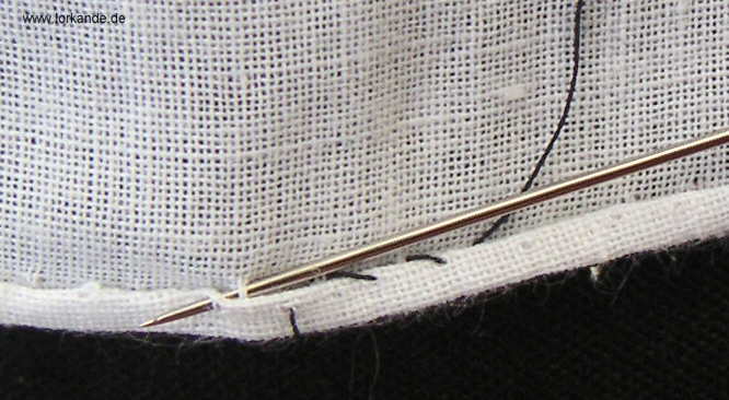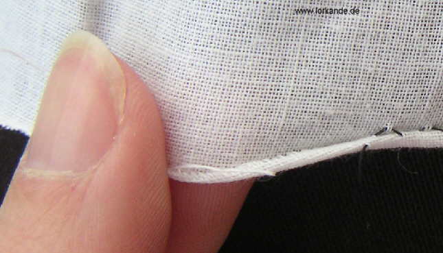 nicht sieht. Und so funktioniert es: Der Saum wird von rechts nach links auf der linken Seite genäht. Die Saumkante wird zwischen Daumen und Zeigefinger gefaßt und zusammengerollt. Die Finger naßmachen hilft dabei manchmal.