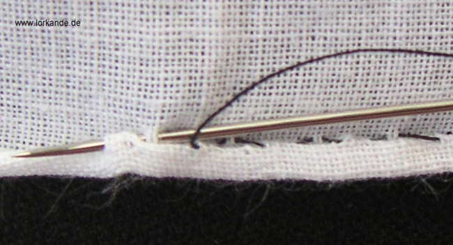 Bei der eiligen Variante wird der eingerollte Saum mit einem überwendlichen Stich locker festgenäht. Dazu sticht die Nadel durch ein oder zwei Kettfäden des Stoffes und wird danach am oberen Ende des Rollsaumes eingestochen. |