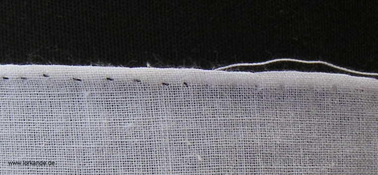hinterstochen wurden. Wenn der Nähfaden locker geführt wurde, sind diese fast nicht sichtbar, weil sie mit den Schußfäden des Gewebes verschmelzen. Auf dem Bild wurde die rechte Hälfte mit weißem Garn genäht, die linke zum demonstrieren mit schwarzem. Achtung: Wird der Nähfaden zu fest gezogen bilden sich auf der Oberseite kleine Dellen! |