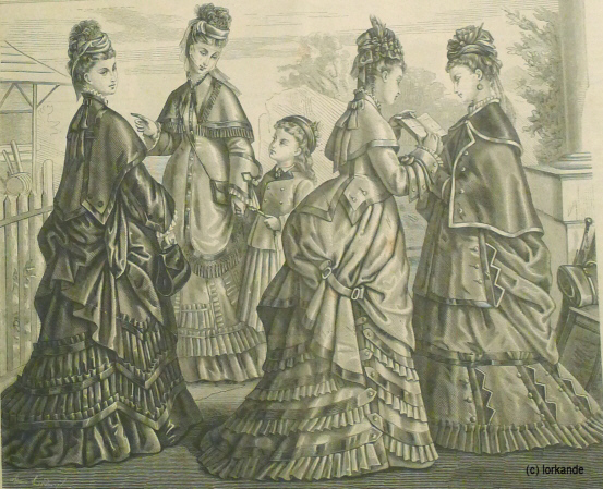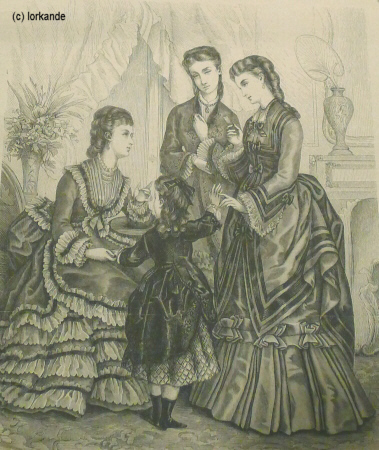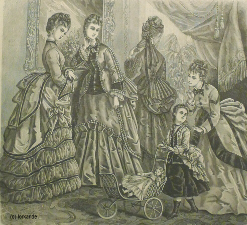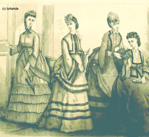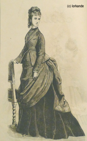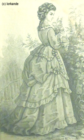 | Üppigere Raffungen mit weichen Falten, reichere Garnituren, nur noch kleine Pagodenärmel, Rocksaum vorne flacher werdend | Rock vorne flach, hinten schleppend, üppigste Garnituren, schmaler werdende Ärmel, Ärmelnaht rutscht auf die Armkugel zurück, Garnitur der Taille passend zum Rock | |||||||