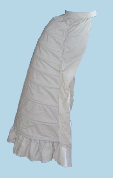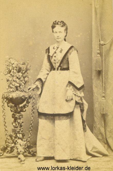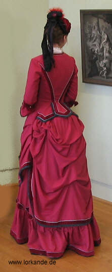 Aus der Krinoline entwickelte sich Ende der 1860er Jahre die Tournüre, ein Begriff, der eigentlich den Rockunterbau meint, sich aber später als Bezeichnung für das gesamte Kleid durchsetzte. Der Unterbau selber ist mäßig ausgeprägt und erzeugt eher eine kontinuierliche Linie im Übergang zur Schleppe. Der vordere Rock wurde vorne und an den Seiten immer flacher anliegend, dafür wurde der hintere Rock mehr und mehr durch Raffungen und große Stoffmengen betont. Die Linienführung ist horizontal, es gibt noch keine optischen Unterbrechungen in der Rockdekoration. Die Garnitur erfolgt hauptsächlich auf dem Rock, die Taille wird nur passend dazu leicht verziert. Auf dem Rock hingegen dürfen sich üppige Rüschen, Volants und Raffungen türmen. Schleppen sind bei allen Kleidern sehr beliebt. Je größer das Portemonnaie und der Repräsentationswert, desto üppiger wie immer das gesamte Kleid. Die Grenze für Fransenbesätze, Kordeln, Quasten, Rüschen und Spitzen ist nach oben offen. Die Tagestaillen sind hochgeschlossen bzw. oft mit einem kleinen V-Ausschnitt versehen, in welchen ein kleiner, stark gerüschter Spitzenkragen eingepaßt ist. Dieser kann vermutlich sowohl direkt mit dem Kleid verbunden sein als auch durch eine Chemisette erfolgen, ein bloßer Kragen mit Schulterpartie zum unterziehen. Der Taillenabschluß liegt etwas über der natürlichen Taillenhöhe, was den Rock noch wuchtiger macht. |