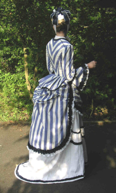 Der Kleideraufbau erfolgt mit Rock, Tunika/Schürze/Überrock und Taille. Sofern die Taille kein Peplum hat, sondern einen bündigen Taillenschluß, sind Gürtel mit kurzen Schurzteilen daran häufig vertreten, die den Verschluß der Tunika kaschieren. Insgesamt ist die Linie der Kleider noch klar strukturiert. Taille, Tunika und Rock bilden eine vertikale Linie, die Rockdekoration eine horizontale. Die Tunika ist im vorderen Teil noch sehr schürzenähnlich und entsprechend kurz. Sie kann zu den Seiten hin gerafft werden oder glatt über den halben Rock fallen. Der hintere Teil wird gerafft, bleibt aber im großen und ganzen in der horizontalen/vertikalen Aufteilung. Wie am Beispiel zu sehen ist sind unendlich viele Rüschen aber keinesfalls zwingend. Die normale Garderobe der mittelständischen Hausfrau wird vor allem praktischen Überlegungen gedient haben und für die Reinigung von 5reihigen Volants sollte man sich in jedem Fall eine Waschfrau leisten können... Wie immer zeigen Modekupfer das Extrem, sozusagen die stilistische Perfektion. Die Hüte sind klein und sitzen oft wie Kappen auf den Frisuren. Die Dekoration ist üppig, oft flattern lange Bänder oder Schleier lose herab. Die Befestigung erfolgt vermutlich durch Hutnadeln und hautfarbene, dünnen Bänder unter dem Kinn. In den frühen 1870er Jahren haben viele Hüte auch noch die in der Krinolinenzeit modischen großen Kinnschleifen. Die Frisuren sind üppig und bestehen wohl bei einem Großteil der Frauen aus falschen Haaren. Lange Lockenpartien im Nacken, Kronen aus falschen Zöpfen und unterlegte Haarteile am Hinterkopf geben auch den notwendigen Halt für die Hutnadeln.