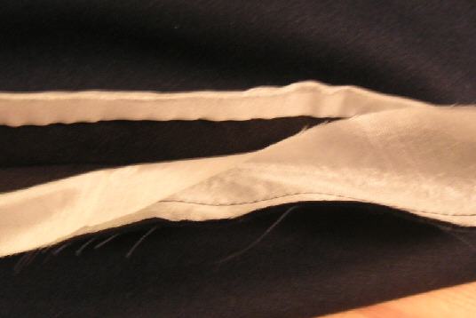 Oberstoff und Futter wurden einlagig verarbeitet, d. h. aufeinandergelegt und wie ein Teil behandelt. Die Nahtzugaben liegen dann offen und werden separat versäubert. In diesem Fall wurden die Zugaben mit Pongé-Seide eingefaßt, dazu wurde ein Seidenstreifen auf der Vorderseite der Zugabe knappkantig aufgenäht, um die Zugabe eingeschlagen und per Hand festgenäht. |