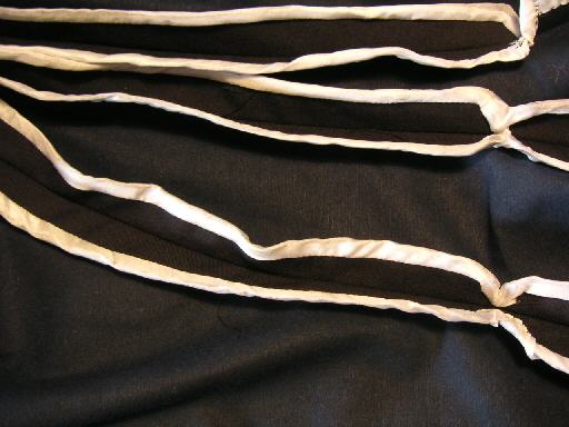 Die Zugabe des Ärmel wurde kurz zurückgeschnitten und mit Seidenband eingefaßt. Bei dieser Taille habe ich den Ärmel von vornherein mit der Hand eingenäht, da durch den dicken Futterstoff und die Paspel zu erwarten war, daß die Maschine sich nicht gerade leicht tut. Handnähen geht manchmal schneller als mehrfaches Auftrennen durch verschobene Maschinenähte... |