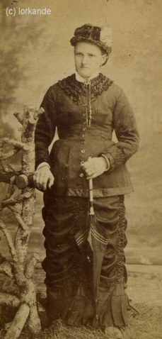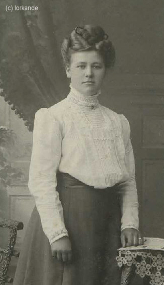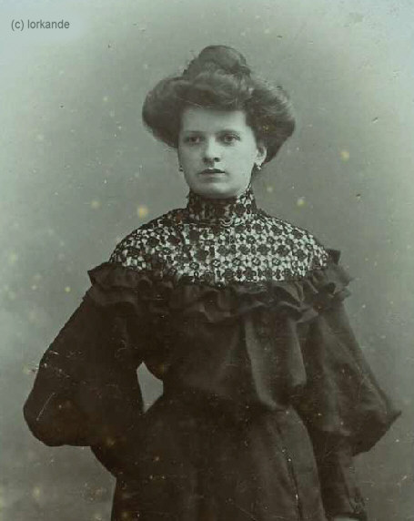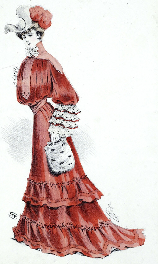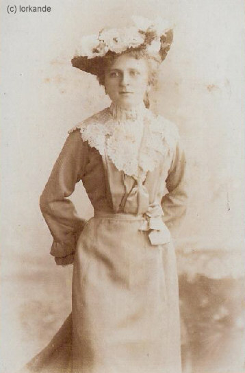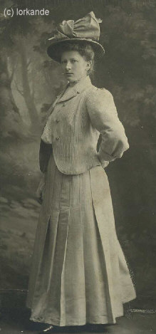 Tatsächlich dürften die meisten Damen wenig "S" in der Linie gehabt haben. Schon deswegen, weil dann das Gehen - noch besser: Treppensteigen - mit dem modischen Sinnbild für Leichtigkeit, Feinheit und florales Fließen kaum vereinbar ist. Wieviel Leidensfähigkeit für Mode in einer Dame steckt, ist schon immer individuell verschieden. Fotos zeigen jedoch, daß der Durchschnitt eine Neigung zum Praktischen hat. Ausnahmen bestätigen bekanntlich die Regel und wenn eine Frau Zeit und Gelegenheit hatte, das Hohlkreuz zu pflegen, dann wird sie es bei genug Ergebenheit gegenüber der Mode auch getan haben. Ein Massenphänomen war es hingegen wohl nicht. |
