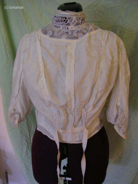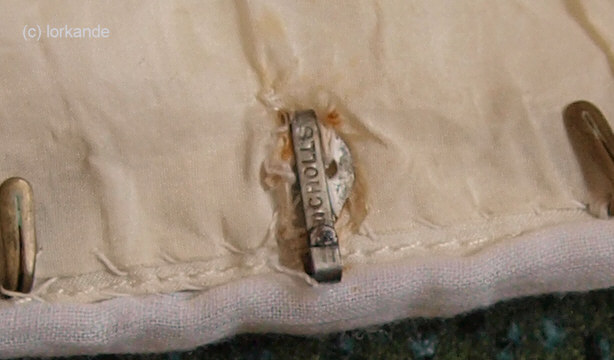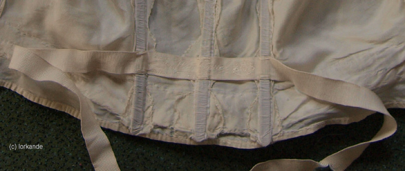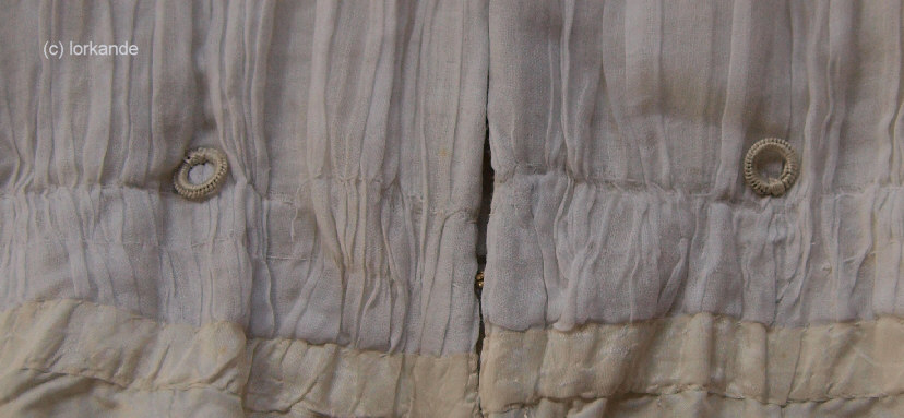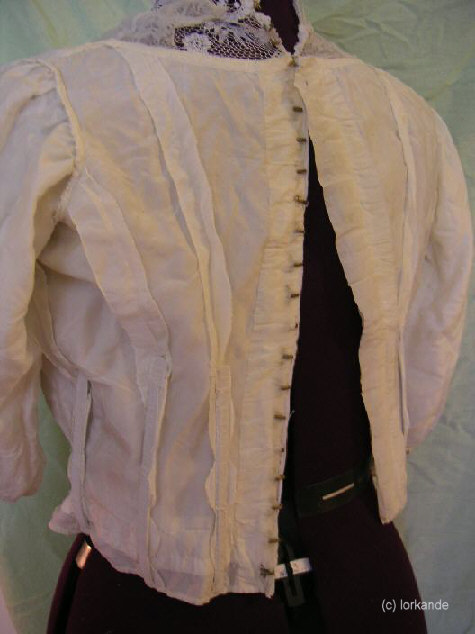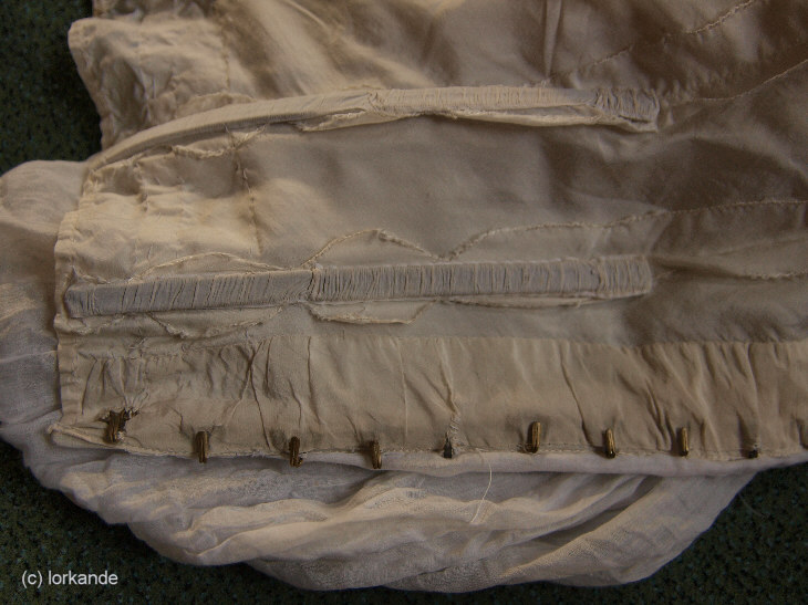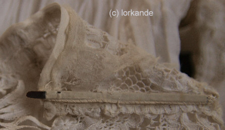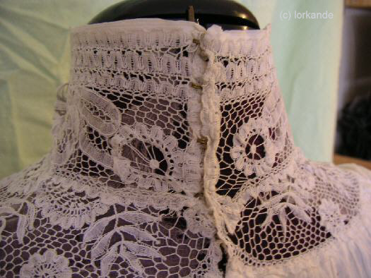 Seidentaft eingesetzt. Am Spitzenkragen befinden sich ebenfalls 3 Stäbchen, jeweils 3-4 mm breit und ebenfalls aus Fischbein. Ein Stäbchen sitzt dabei direkt unter den handgemachten Ösen, die anderen beiden jeweils im seitlichen Halsbereich.