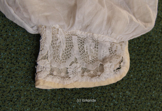gefaltetem Batist besetzt, wobei die Fältelung am hinteren Ärmel