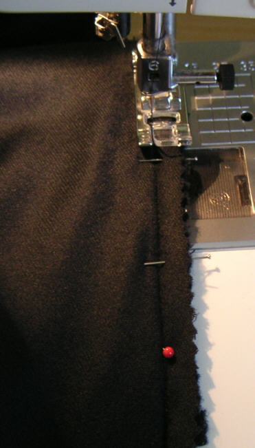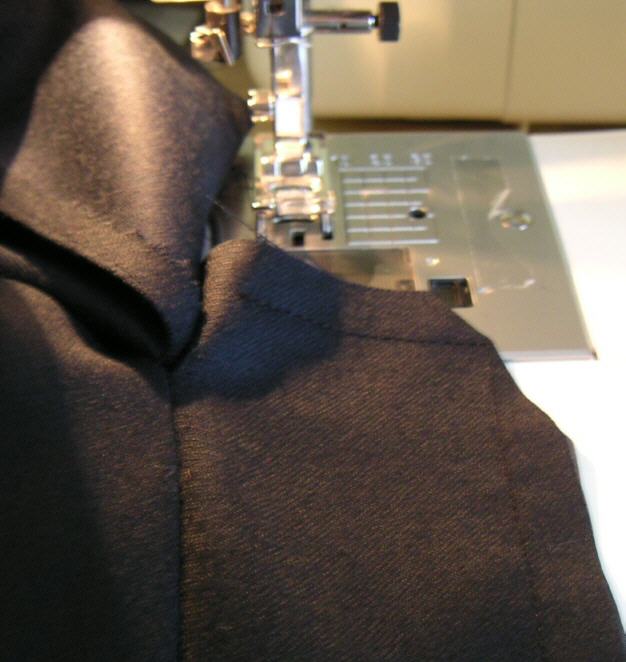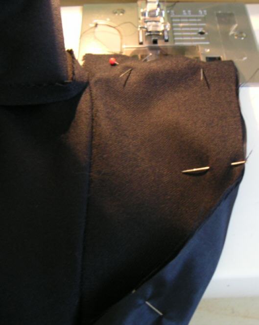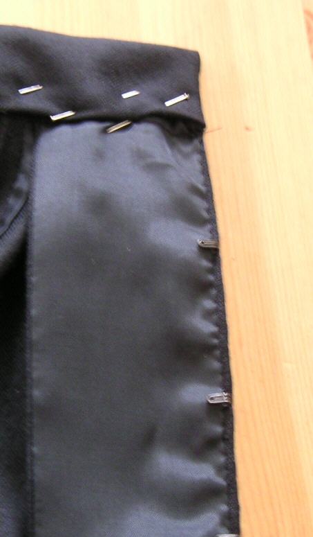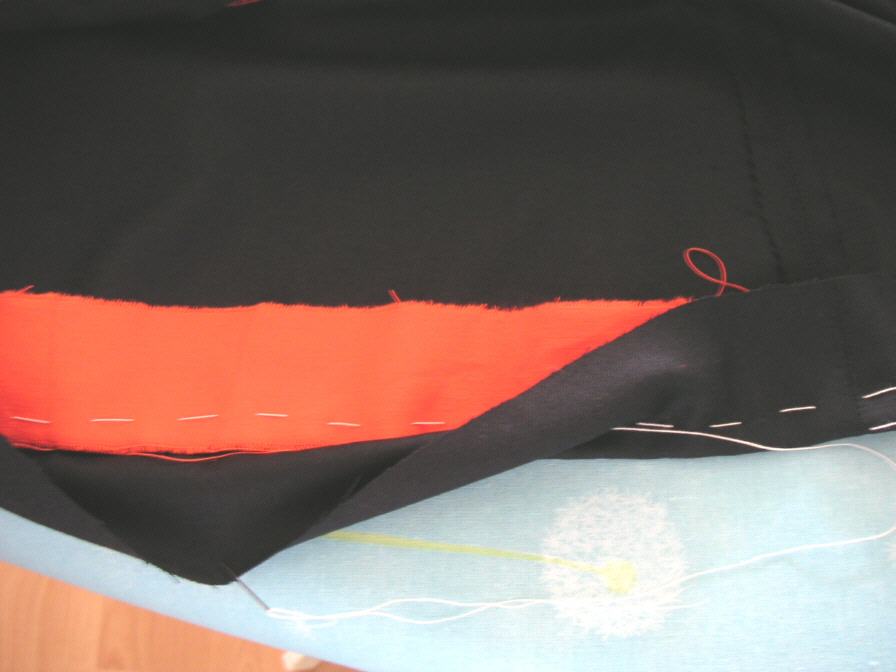Die Schnitteile werden zuerst im Futter zugeschnitten, geheftet und angepaßt. Eventuelle Änderungen werden dann ggf. auf den Schnitt übertragen und der Oberstoff nach dem Futter zugeschnitten. Alle Teile werden entsprechend den Markierungen zusammengenäht und die Nähte versäubert. Bei wenig fransenden Stoffen können alle Kanten mit schrägem Fadenlauf (alle Nähte bis auf die Seitennähte) gezäckt werden. Eine weitere Möglichkeit ist das Einfassen mit Futterstoff. Wenn eine Verzierung der Nähte gemacht wird, sollte dies jetzt erfolgen. Eine einfache Möglichkeit dazu ist das feststeppen der Zugaben knappkantig neben der Naht. Im Schlitz wird die Zugabe ebenfalls komplett festgesteppt. Danach wird der Verschluß eingenäht. Dafür wird ein Untertritt von rund 7 cm Breite und jeweils 1 Beleg aus Oberstoff und Futter in 7 cm Breite benötige. Alle Teile sollten ca. 2 cm länger sein als der Schlitz. Wenn keine Nahtverzierung gemacht wird muß die Stichlänge für das Einnähen in den Schlitz vergrößert werden. Der Untertritt wird an einer Seite sowie der unteren Kante verstürzt, die offene Kante versäubert und dann rechts auf rechts an die restliche Nahtzugabe der linken Schlitzöffnung genäht. Die Naht verläuft dabei nur bis zum Nahtende der rückwärtigen Naht (rote Nadel). Bei einer Nahtverzierung nun nochmals von der rechten Seite den Untertritt feststeppen, dabei eine größere Stichlänge verwenden.