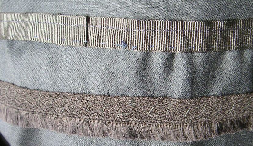 am Saum angenäht, die obere Kante wird mit der Maschine festgesteppt. Der Saum kann jedoch auch unsichtbar angenäht werden oder gleich mit mehren parallelen Nähten, das ist eine reine Geschmacksfrage. Als Saumschutz ist eine Besenborte angenäht, deren "Besen" über die Saumkante hinausragen. Eine auf die Kante gesetzte Kordel ist aber genauso möglich. Und fertig ist der Rock! |