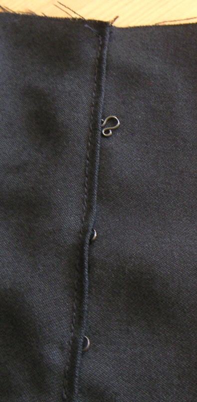 ![]() Jetzt werden die Haken und Ösen eingesetzt. Im linken Schlitzteil werden die Ösen mit den kleinen Rundungen durch die Stiche der Naht geschoben und von innen auf der Zugabe festgenäht. Auf der rechten Seite werden paßgenau die Haken so festgenäht, daß der Schlitz ohne Lücke schließt. Danach wird das Futter an der noch offenen Kante eingeschlagen und mit der Hand festgenäht. Es verdeckt dabei die Haken zum Teil. Danach wird der Bund angesteppt und innen per Hand angenäht. Nun wird die Länge des Rockes festgelegt. Die Saumkante wird am besten durch Heftstiche markiert. Dann wird die Saumzugabe auf die Saumweite angepaßt. Der Saum wird umgelegt und auf dem Rock festgesteckt. Er sollte dabei nicht zur Seite gezogen werden. Die Mehrweite der Zugabe wird mit kleinen Heftstichen soweit eingereiht, daß sie die Saumweite zwischen den Nadeln erhält. Danach wird eine Saumverstärkung eingearbeitet. Diese sollte nicht zu steif sein, damit sie den Fall des Rockes nicht behindert. In meinem Beispiel habe ich für einen mittelschweren Wollstoff Baumwollköper genommen. Die Verstärkung ist fast so breit wie der fertige Saum und wird zwischen Rock und Saum festgeheftet.