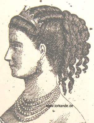 frisieren bzw. anstecken. Das Diadem oder ein Band als Abschluß zwischen