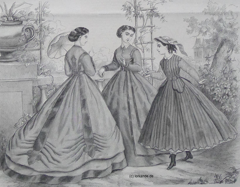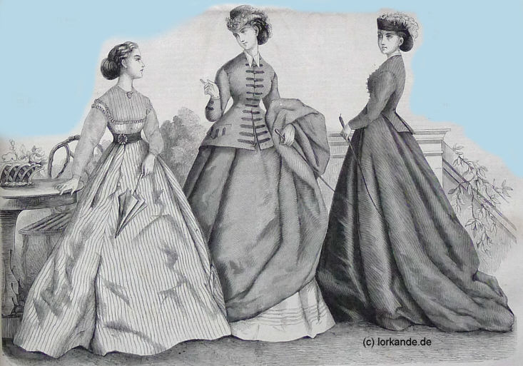 geschlossen. 2. Reitanzug "Louis XIII". Ein Keilrock nebst Casaque aus feinem dunkelgrünen Tuch, mit Brandebourgs von Posamentierarbeit garniert, sind die Bestandteile dieses Anzugs; dazu ein rundes Hütchen mit aufgeschlagenem Rande aus italienischem Stroh, mit einem Tuff weißer Federn geschmückt. 3. Reitanzug "Jockey". Robe von braunem Alpacca, hohe Taille mit kurzem eckigem Schooß. Die einfache Garnitur besteht in einer braunen Seidencorde, welche den unteren Rand des Rockes, wie den der Taille umgiebt. Toque von braunem Stroh mit weißen Federn. |