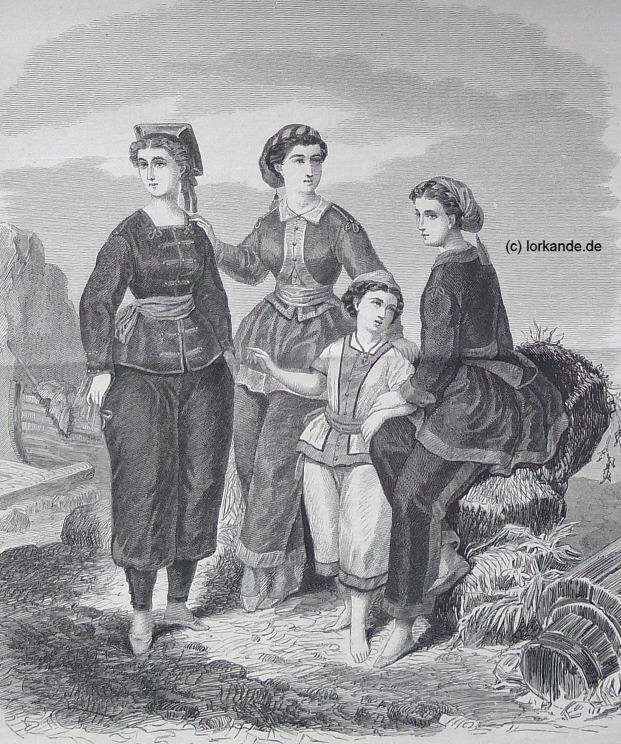 Schwimm- und Badeanzüge 1. Das in Gamaschen endigende Beinkleid, wie die Jacke mit Schooß, ist von orangefarbenem Flanell, beide sind nach Angabe der Abbildung mit weißer Wollenlitze und weißen Knöpfen besetzt. Schärpe von weißem Flanell, orangefarbenes, eckiges Mützchen, wie die Gamaschen mit schwarzer Wollenlitze garniert. 2. Dieser Badeanzug besteht aus Beinkleid, Weste und kurzem Jäckchen aus lichtblauem Flanell, die Garnierung aus weißem ähnlichem Wollenstoffe. Weißer Flanellkragen und weiße Flanellschärpe; Achselgarnitur aus weißer Wollenlitze. Käppchen à la pescatore mit Quaste aus lichtblauem Flanell, vorn mit einem weiß und blau umwundenen Röllchen verziert. 3. Das aus weißem Flanell hergestellte Beinkleid, sowie die Jacke mit Schooß, ist mit rothem Flanell garniert; dieser je an den Außenrändern von schwarzer Wollenlitze begrenzt. Rothwollenes Käppchen. 4. Beikleid und Jacke mit Doppelschooß aus dunkelbraunem Flanell, nach Angabe der Abbildung mit Streifen lichtbraunen Flanells garniert., der kürzere Schooß mit ähnlichem Flanell gefüttert. Gürtel ebenfalls aus ähnlichem lichtbraunem Wollenstoffe. Käppchen à la pescatore von dunkelbraunem Flanell, am vorderen Rande mit einem aus licht- und dunkelbraunem Flanell gewundenen Röllchen verziert. Die Badepantoffeln entweder aus Strohgeflecht oder grauem Garn gehäkelt. |