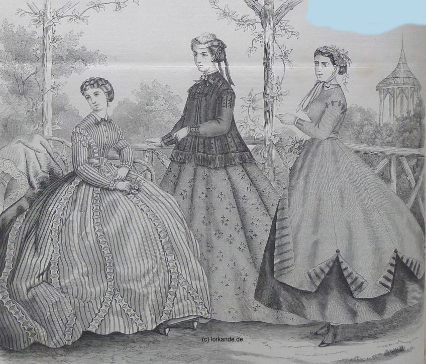 Faltenlagen der geschürzten Roben gehalten werden. 2. Robe von hellbraunem Taffet. Die Garnitur aus Schrägstreifen in dunklerer Nüance bildet auf dem Rock eine Tunika, imitiert die Epauletten und schmückt die Ärmel in der Weise der Abbildung. 3. Anzug für Mädchen von 12-14 Jahren. Robe aus blau und weiß gestreiften Taffetas d´Irlande . Die Garnitur an dem gebogten Außenrande des Rockes, an der Taille und dem Schooß besteht in einer 2 Cent breiten Einfassung aus Schrägstreifen blauen Taffets, welche mit zwei Reihen weißer Seidensoutache besetzt ist. Der Anzug wird durch eine weiße, an Kragen und Ärmeln mit dem Anzug übereinstimmend garnierte Kaschmirbluse vervollständigt, deren Ärmel die der Taille ersetzt. |