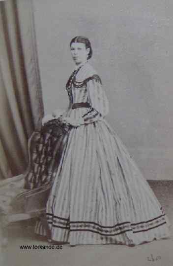 "crin", was der Krinolinenmode den Namen gab. Ab 1856 kam die Stahlreifenkrinoline auf den Markt, entweder als Käfigkrinoline nur aus Stahlreifen, verbunden mit Haltebändern, oder aus Stoff mit Tunneln für die Reifen. Diese Erfindung sorgte durch weniger Unterröcke für mehr Beinfreiheit, machte aber auch größere Rockumfänge möglich. Abhängig von Geldbeutel, Geltungsdrang, Stand und Gelegenheit waren vor allem in den 60er Jahren Krinolinenumfänge bis zu 6 m möglich, die durchschnittliche Krinolinenträgerin begnügte sich noch in den 1850er Jahren mit bis zu 2 Meter Umfang und später mit rund 4 m. Die Krinoline war in allen Gesellschaftsschichten ein übliches Kleidungsstück, auch Arbeiterinnen trugen eine, wenn auch meistens in moderatem Umfang. Der Rockstoff war am Bund in tiefe Falten gelegt, der Rock selber oft mit großzügigen Volants verziert. Die in den 50er Jahren noch schmale Glockenform wurde in den folgenden Jahren immer weiter, runter und kuppelförmiger. Nachdem diese Variante ausgereizt war wurde die vormals kreisrunde Krinoline langsam elliptisch, der Hauptteil des Rockstoffes verlagerte sich nach hinten. Diese Formveränderung nahm immer mehr zu, die Frontpartie flachte zusehends ab und verführte die Mode zur Einführung der Tournüre. Die ersten Tuniken wurden über den Röcken getragen, die ersten Raffungen tauchten auf - die Tournürenmode war entstanden. |