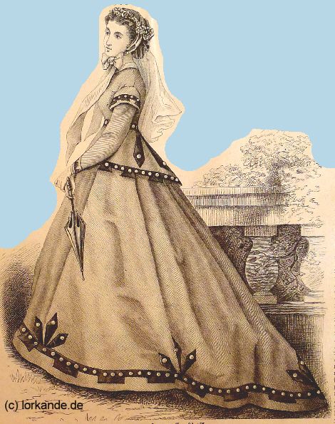 Dennoch sollte der Vollständigkeit halber eine her, wegen der sportiven Hutformen ein Modell der späten Krinolinenzeit, genauer aus dem Jahr 1866, nachdem die elliptische Krinoline modern wurde. Im Gegensatz zu der klassischen, runden und kuppelförmigen Krinoline begann mit der elliptischen schon der Weg zur Tournüre, die Seiten wurden deutlich flacher, die Front zum Körper herangezogen und die ganze Weite des Rockes lag in der flach abfallenden, meist schleppenden Hinterpartie. Die Modewelt der Zeit damals beklagte sich nicht wenig über die neuen "Keilroben", deren Material sich aufgrund des keilförmigen Zuschnitts des Rockes nur noch schlecht weiterverarbeiten ließ. Der bisherige Anspruch an ein Kleid, 10 Jahre zu halten, mußte aufgegeben werden. Entsprechend trug nicht jede Dame eine Keilrobe, auch in den Modezeitschriften wird noch unterschieden zwischen der "aktuellen Keilrobe" und "der alten Rockform", also mit tiefen Falten am Bund. Für einen ausgeprägten elliptischen Unterbau benötigt man allerdings fast keilförmige Bahnen, weil die Rockweite sonst nach vorne fällt, anstatt elegant nach hinten zu wallen. |
