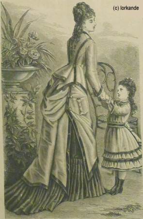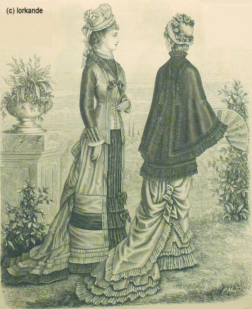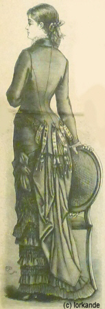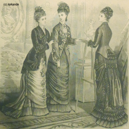 | Rock immer schmaler werdend, Raffungen weniger voluminös, schmale Ärmel | Rock immer schmäler, Tournüren-Unterbau kaum noch vorhanden, mehr Raffungen mit kleinen Falten, länger werdende Taille | |||||