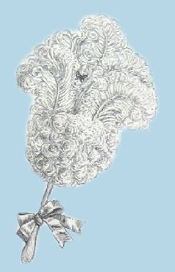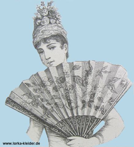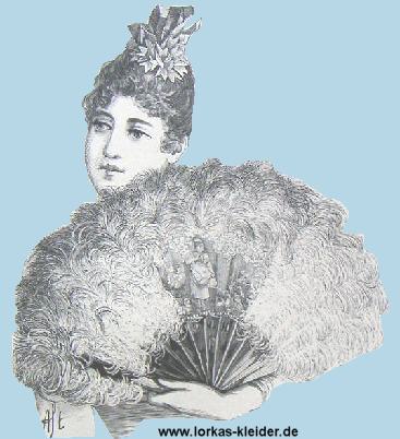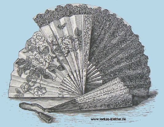 20 cm langer Griff aus Elfenbein, insgesamt ist der Fächer 60 cm lang. In der Mitte des Fächers ist ein Reiherstutz angebracht, auf dem sich ein kleiner Schmetterling als Verzierung schaukelt. | Cretonne oder Satin, grau mit bemalten oder bedruckten Blumen, Gestell vergoldet, 42 cm Länge und 80 cm Weite | links doppelter Crepe in