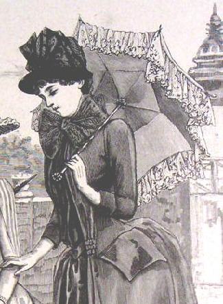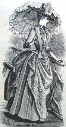 aber da geht eine Dame ja eh nicht vor die Tür... Ab Mitte der 80er wurde der Entoutcas sehr populär, ein schwarz bezogener Regen- und Sonnenschirm, eben ein Schirm für alle Fälle. Allerdings ist ein schwarzer Schirm nicht wirklich der Optik förderlich, genau genommen ruiniert er im Schirmschatten den Teint und wird auch zu den meisten Kleidern in unschönem Kontrast stehen. Wenn man Zeitgenossen glauben darf, hat der Entoutcas keine andere Daseinsberechtigung, als praktisch und häßlich gleichermaßen zu sein und muß leider darauf verzichten, "zur Erscheinung der Frau in irgendeine günstige Beziehung zu treten" (von Sydow, 1880). Trotzdem hat sich der Schirm aber ziemlich durchgesetzt, denn je näher das Jahrhundert dem Ende zugeht, desto mehr Frauen sind auf praktische Kleidung und Accessoires aus. Die immer zahlreicher werdende Berufstätigkeit und neue Freizeitbeschäftigungen geben dafür Anlaß. Der optimale Schirm hingegen ist farblich passend auf das Kleid abgestimmt, wobei der Bezug dem Oberstoff entspricht und das Futter dem Basisstoff des Kleides. Überhaupt ist ein Schirmfutter für jeden etwas schickeren Schirm ein Muß. Am glücklichsten sind dabei für blonde Frauen rosa bzw. rote Futtertöne sowie für Brünette gelbe. Diese heben jeweils optimal den Teint hervor. Allerdings paßt nicht zu jedem Kleid ein rotes Schirmfutter. Und nicht jeder möchte Schirme sammeln, also tut es wohl ein heller, ungefütterter Schirm in vielen Fällen auch. Auf jeden Fall sind Schirme in Lila und Braun zu meiden, da man in deren Schirmschatten grau und ungesund aussieht. |