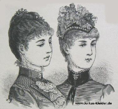 links: Man scheitelt das in der vorderen Mitte geteilte Haar quer über dem Kopf , bildet auf der Höhe desselben ein fest zusammengedrehtes Zöpfchen und ordnet um dieses schneckenförmig das an beiden Seiten zurückgenommene Vorderhaar. Hierüber kämmt man nun die obere Partie des Hinterhaares und teilt die untere in zwei Strähnchen, welche, je leicht gewunden, sich rechts an die Mittelpuffe legen. Schließlich werden aus sämtlichen Spitzen die beiden in der Abbildung ersichtlichen Puffen in der vorderen Mitte gebildet. rechts: Stuart-Schnebbe: Form aus einer mit Draht begrenzten Passe und faltig mit rotbraunem Samt bekleidet. Den hinteren Rand garniert fächerartig gelbliche Spitze (200 cm lang, 10 cm breit), welche in der vorderen Mitte schnebbig überfällt. Auf der Spitze ruht ein Rosenzweig während große, gelbliche Wachsperlen den Rand der Passe verzieren. |