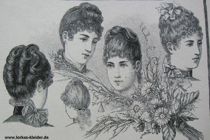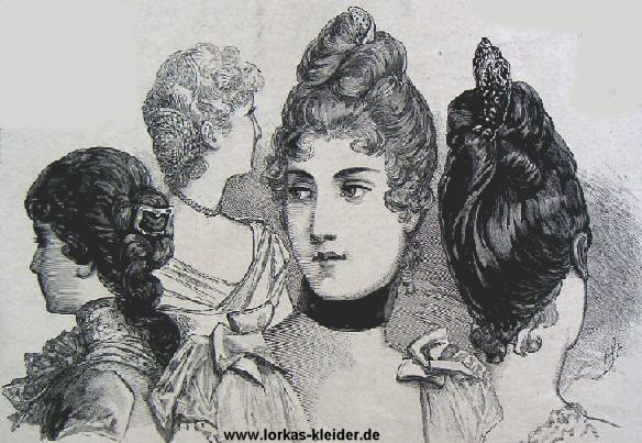 links: Frisur mit losem Knoten Für lockiges, nicht besonders langes Haar. Das Haar wird durch die mit durchbrochenem Schild gearbeitete Nadel gezogen und so verschlungen, daß die Locken in den Nacken fallen. 2. v. l: Englische Haarfrisur Das stark gewellte Vorderhaar wird zurückgekämmt und mit dem Hinterhaar in mehrere kleine Zöpfe geflochten. Aus diesem wird dann ein rundes Nest gebildet. rechts: Haarfrisur mit Puffen Für nicht zu langes Haar. Es wird ein Scheitel quer über den Kopf gezogen und ein kleiner Teil des Hinterhaares gedreht oder geflochten aufgesteckt, das Vorderhaar wird nach hinten gekämmt und leicht gedreht auf der Höhe des Kopfes zu einem Knoten geschlungen. Das restliche Hinterhaar wird in drei gleiche Strähnen geteilt, die über dem Finger aufgerollt und zu Puffen geordnet werden. |