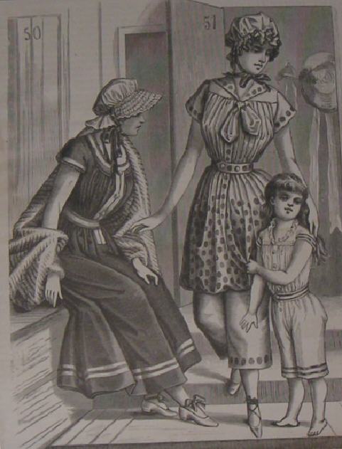 Schottische Flanellkleider: Kleider für den Urlaub im Gebirge werden aus schottischen Flanellstoffen gemacht, teilweise aus Wolle, teils aus Baumwolle im Tartanmuster. Es sind leichte Stoffe, jedoch ausreichend wärmend für kühlere Witterung in den Bergen. Sie werden ähnlich wie Tenniskleider verarbeitet, mit vollem, fußlangem Rock und Bluse oder aber etwas konventioneller mit gegürteter Taille. Diese hat einen gerafften Sattel und eine volle Schulter. Der Rock wird mit Kiltfalten drapiert mit nur wenig Auszier. Der Gürtel des Rocks wird innen in der Taille angeknöpft. Weiterhin ist sind Kleider aus weißem Flanell mit Tartan in marine, dunkelrot oder braun in tailormade Verarbeitung modern. Die einfachen Taillen haben ein kleines Schößchen, sie haben den Verschluß aus Perlknöpfen auf der linken Seite. Dieser bildet ein spitz zulaufendes, einfaches Revers. Der hohen Kragen und die Manschetten sind einfach verarbeitet. Als Rockdraperie dient ein Überrock mit tiefen, offenen Falten (burnous folds) im Rücken, die tief auf einen einfachen Rock fallen. Diese recht farblosen Kleider haben einen frischen Look und werden Morgens und Nachmittags getragen. Falls mehr Farbe gewünscht wird, sollte der Rock im Vorderteil eine Faltengarnitur aus Seide oder Surah in marine oder dunkelrot sowie einige Schleifenverzierungen erhalten. Als Auszier für Wandergarderobe in marine oder dunkelrot dient Leder an Saum, Gürtel, Kragen und Manschetten in ecru oder rostfarben sowie Seitendekorationen mit Gürtel und Schließe. Der passende Hut mit hoher oder runder Krone ist aus dem Kleiderstoff gemacht, dekoriert mit Lederband und Schließen. Die Schuhe sind aus gleichem Leder. Grundsätzlich sollten die Kleider fürs Gebirge aus leicht waschbaren Stoffen sein, also Serge, Flanell oder Canvas. Die Hauptfarbe ist Weiß. Für Tageskleider werden tailormade Kleider empfohlen mit weißer Posamentenverzierung. Besonders modische Kleider haben große Muster in Schwarz, Marine oder Kupferrot auf weißem Grund. Säume, Kragen und Manschetten werden dann in farblich passendem Samt gemacht. Muster waren große Motive wie Palmen, Kreise, verflochtene Ketten o. ä. modern. |